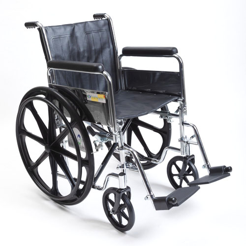 Detachable Arm and Footrest (DAF) wheelchair with a sturdy chrome steel frame. DAF features allow for easier transfer to-and-from the wheelchair.