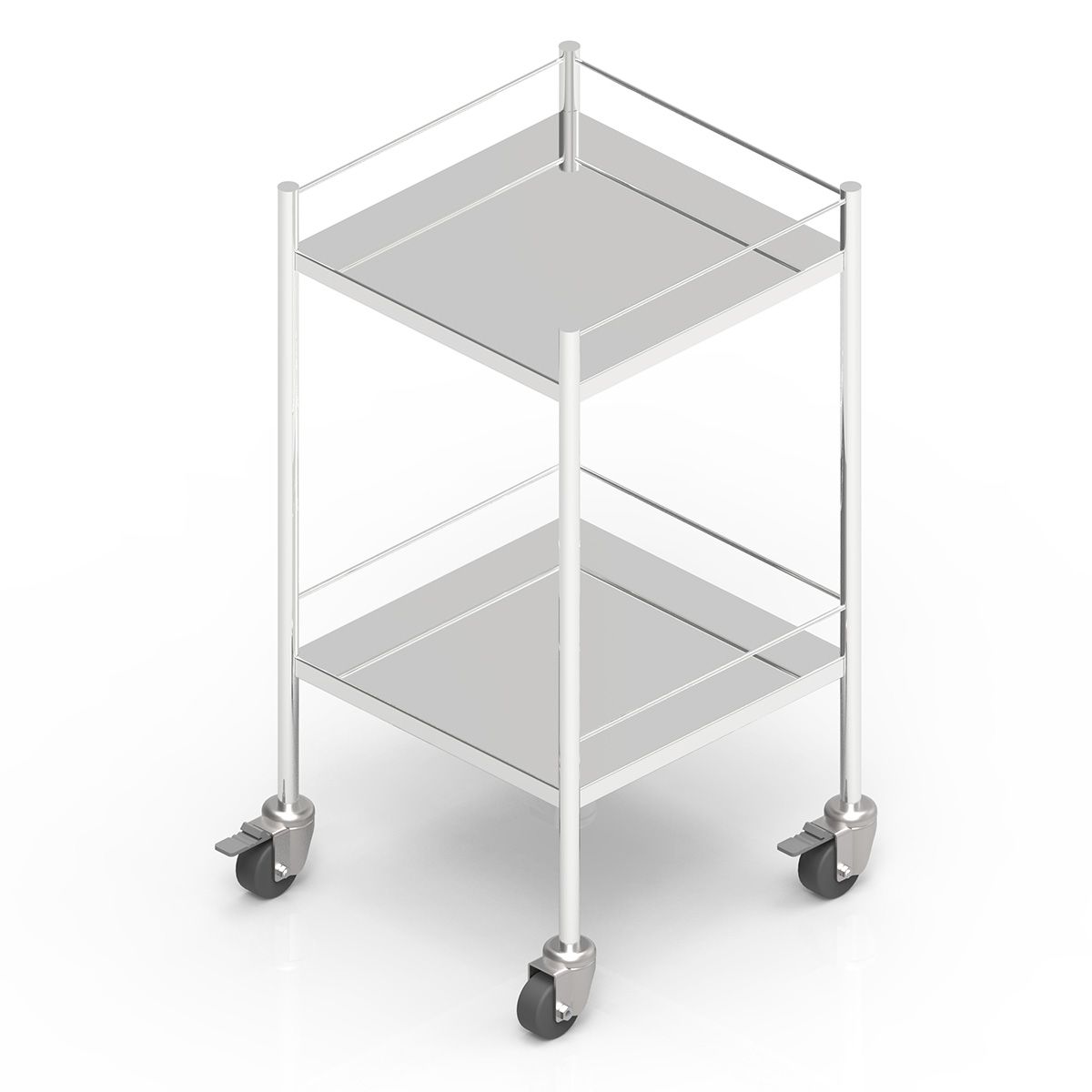 Constructed in Stainless Steel (304). Comes with 2 shelves with guard rails on 3 sides. Mounted on 3” Castors; 2 with brakes.